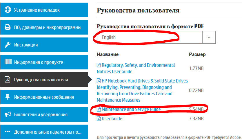 3. Не выберите язык искомого English, т.к. вся техническая документация доступна на нем. Интересующий вас документ называется «Maintenance and Service Guide».