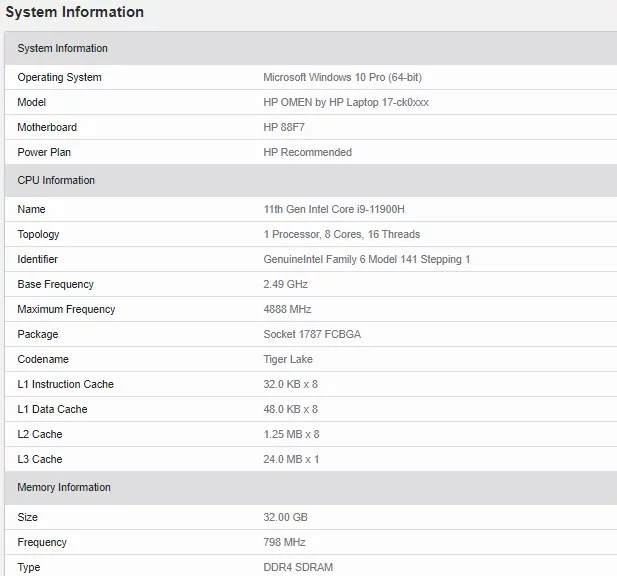 Данная версия протестирована с процессором Intel Core i9-11900H, который обладает 8 ядрами и 16 потоками, с максимальной тактовой частотой до 4,9 ГГц. Базовая же тактовая частота держится на уровне 2,5 ГГц. Обеспечивается поддержка оперативной памяти DDR4-3200. Протестированный ноутбук был оборудован 32 Гбайт ОЗУ.
