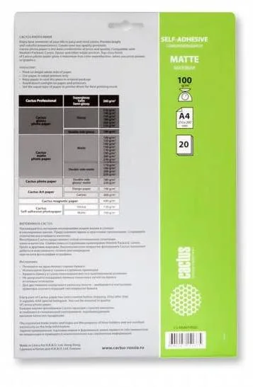 Фотобумага Cactus CS-MSA410020 A4/100г/м2/20л./белый матовое самоклей. для струйной печати